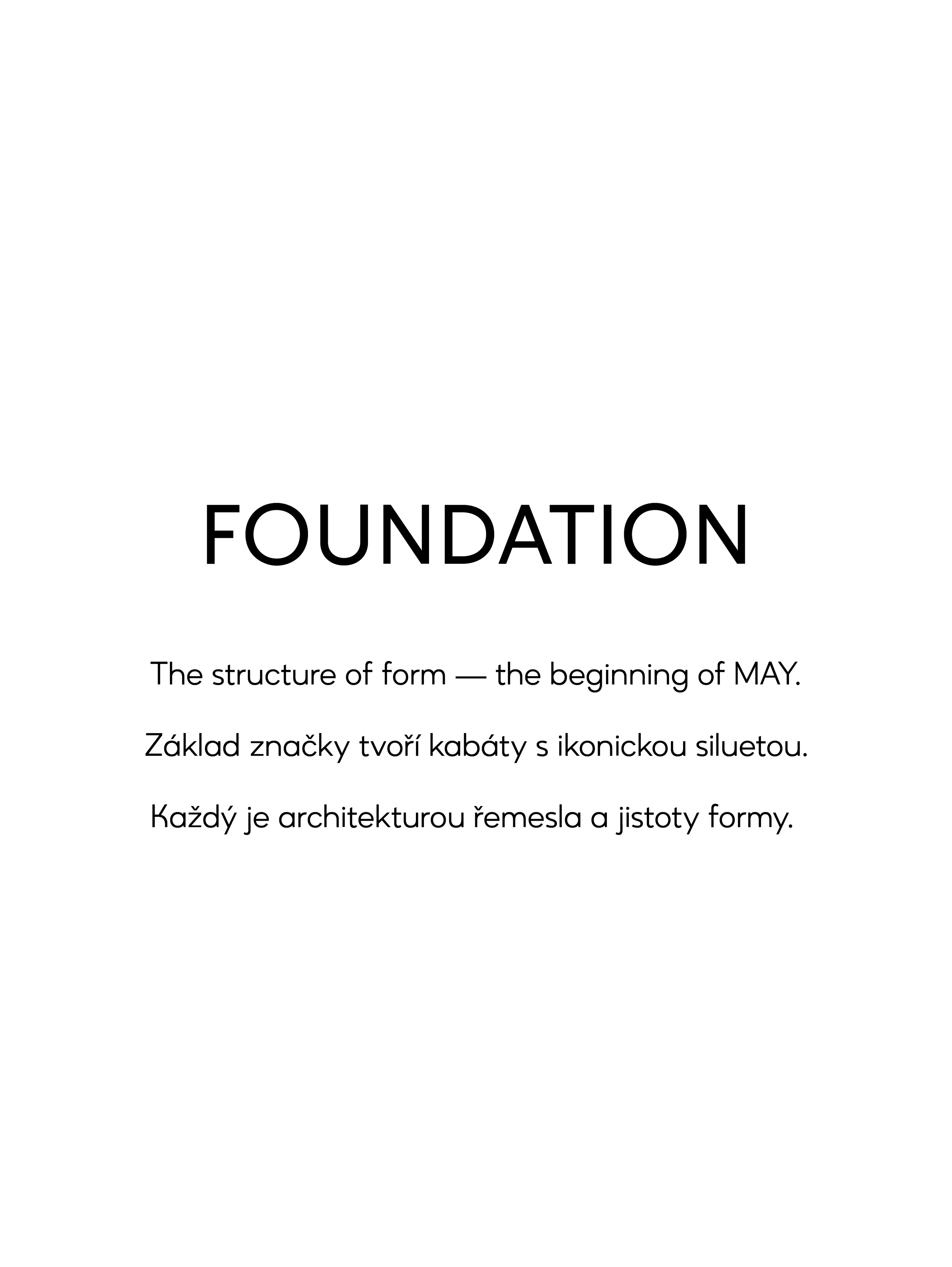 Kolekce Foundation představuje samotnou podstatu značky MAY — strukturu, tvar a proporci. Každý kabát vznikl jako studie siluety a linie. Minimalistická estetika, precizní střih a nadčasová ženskost tvoří její základ.